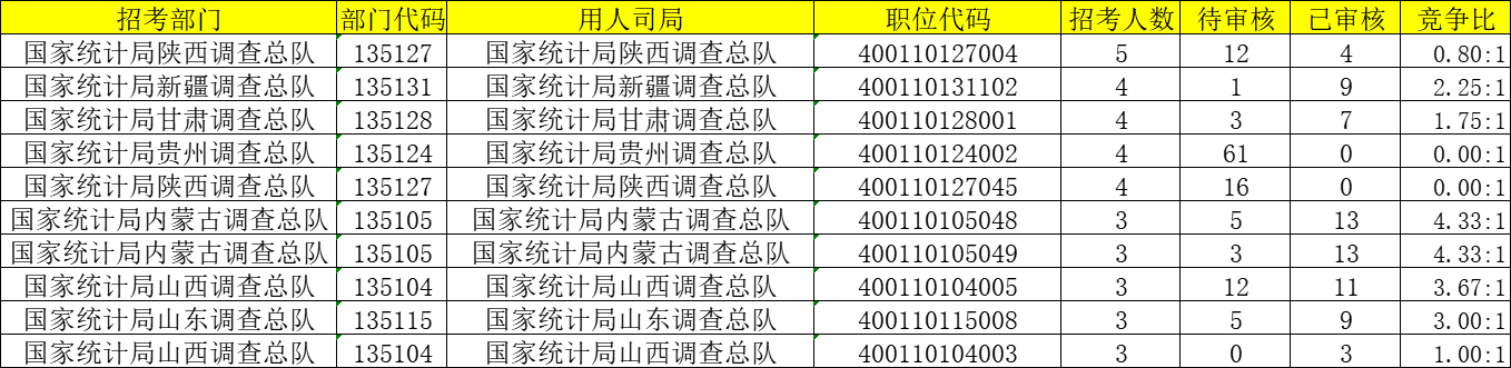 我們可以看出來統(tǒng)計(jì)局系統(tǒng)招考人數(shù)并不是很多,5人已經(jīng)是招錄最多的職位,部分是招錄3人,可以預(yù)見未來競爭的激烈程度,所以大家應(yīng)理性報(bào)考,根據(jù)自身優(yōu)勢條件進(jìn)行報(bào)考,減少競爭壓力。