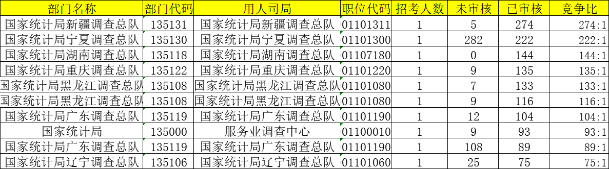 我們從上表不難看出,目前“國家統(tǒng)計(jì)局新疆調(diào)查總隊(duì)烏魯木齊調(diào)查隊(duì)業(yè)務(wù)科室一級科員”職位競爭最為激烈,僅招錄1人的情況下,有279人報(bào)名,競爭比高達(dá)274:1,可見競爭的激烈程度!競爭激烈原因有以下三點(diǎn):1.該崗位專業(yè)要求包含經(jīng)濟(jì)學(xué)類、統(tǒng)計(jì)學(xué)類、管理學(xué)類這三大類,與其他地區(qū)崗位要求相比,專業(yè)限制更加寬松;2.該崗位僅限本科報(bào)考,對于應(yīng)屆生來說十分友好;3.在基層工作年限、政治面貌、基層服務(wù)等方面不作任何要求。綜合上述三點(diǎn),該崗位競爭人數(shù)尤其多,所以還有想報(bào)考該崗位的同學(xué)一定要考慮清楚!謹(jǐn)慎選擇!