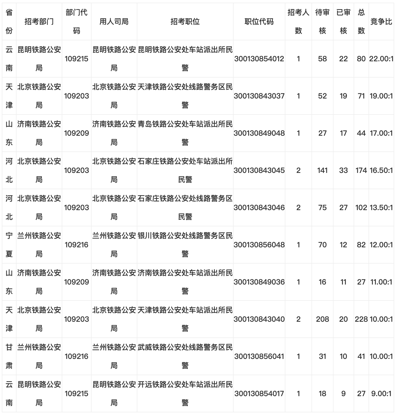 表2鐵路公安系統(tǒng)報(bào)名人數(shù)前十的崗位情況(截止28日17:00前)