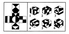 65.下圖左為一展開的平面圖形,下圖右給出的6個立方體中,不能由該平面圖形折疊而成的有( )。