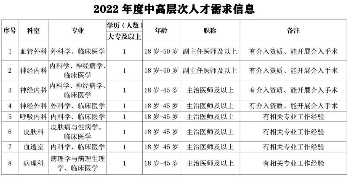 因工作需要,根據(jù)我院2022整體發(fā)展規(guī)劃和2022年用人需求計劃,為確保招聘工作順利開展,滿足醫(yī)院發(fā)展需要,結合我院實際,按照“公開、公平、公正”和“競爭、擇優(yōu)”的原則,現(xiàn)將我院2022年度崗位需求計劃面向社會公開自主招聘,有關事項公告如下,歡迎大家報名投檔。