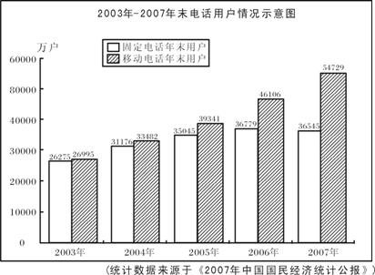 96.2003年至2007年間,我國固定電話用戶與移動電話用戶數(shù)量最接近的年份是