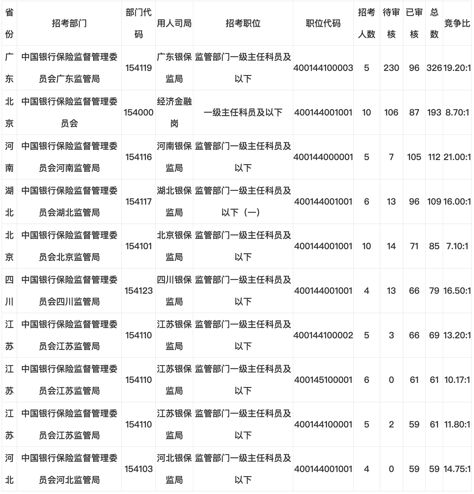 銀保監(jiān)會(huì)系統(tǒng)第二日所有報(bào)考人數(shù)如表2所示,其中“廣東銀保監(jiān)局”的“監(jiān)管部門一級(jí)主任科員及以下”崗位是報(bào)考人數(shù)最多的部門和崗位,報(bào)名總?cè)藬?shù)達(dá)到了326人,競(jìng)爭(zhēng)比達(dá)到了19.20:1,位于第二名和第三名的分別是“中國(guó)銀行保險(xiǎn)監(jiān)督管理委員會(huì)經(jīng)濟(jì)金融崗”的“一級(jí)主任科員及以下”崗位和“河南銀保監(jiān)局”的“監(jiān)管部門一級(jí)主任科員及以下”崗位,報(bào)名總?cè)藬?shù)分別是193人和112人。