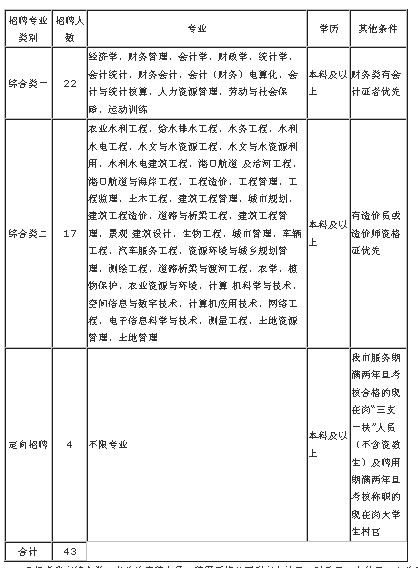 凡報考我市綜合類一專業(yè)的應(yīng)聘人員,聘用后將分配到市人社局、財政局、文體局、農(nóng)業(yè)局、經(jīng)信局、開發(fā)區(qū)、白洋鎮(zhèn)政府、顧家店鎮(zhèn)政府、七星臺鎮(zhèn)政府等單位所屬事業(yè)單位;報考綜合類二專業(yè)的應(yīng)聘人員,錄用后將分配到市水利局、交通運(yùn)輸局、審計局、國土資源局、住建局、農(nóng) 業(yè)局等單位所屬事業(yè)單位。